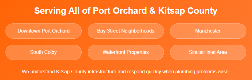Our Port Orchard service area includes downtown Port Orchard, Bay Street neighborhoods, Manchester, South Colby, and surrounding Kitsap County communities. We understand the local infrastructure and respond quickly when plumbing problems arise.